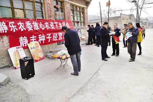 3月15日, 靜樂縣農(nóng)委工作人員深入該縣五家莊村、 木瓜山村、 溝口村開展 “放心農(nóng)資下鄉(xiāng)進(jìn)村” 宣傳活動。此次活動共向群眾發(fā)放 《購種提示》 、 《歡迎使用12316農(nóng)資打假投訴舉報電話》 、 《高毒和禁用農(nóng)藥清單》 、 《種子法》 摘要等宣傳資料3000余份。(閆曉梅 攝)