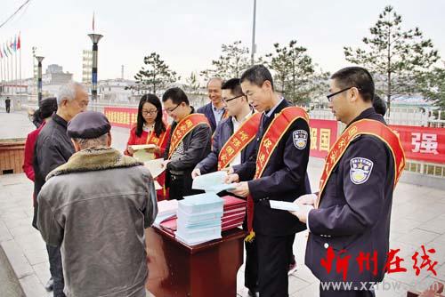 4月15日是全民國家安全教育日,神池縣開展多種形式的宣傳教育活動(dòng),在各種公共場所設(shè)立宣傳專欄,在縣人民廣場進(jìn)行安全法宣傳教育。圖為當(dāng)天上午,縣國家安全領(lǐng)導(dǎo)小組辦公室工作人員走上街頭向過往市民散發(fā)國家安全法宣傳資料。 (楊晉明 詹俊杰 攝)