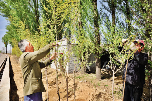 代縣縣委、縣政府堅持“生態(tài)綠色發(fā)展,共建美好家園”的執(zhí)政理念,今春鋪開了總投資1120 萬元的108 國道東段通道綠化工程、投資2000 多萬元的鞏固退耕還林項目干果經(jīng)濟林工程和京津風(fēng)沙源治理工程以及全民義務(wù)植樹工程,切實做到規(guī)劃高起點、施工高質(zhì)量、建設(shè)高標(biāo)準(zhǔn)、開發(fā)高效益。代縣作為京津地區(qū)的風(fēng)沙源頭,通過歷年堅持不懈的生態(tài)綠化,全縣已擁有林地面積171 萬畝,占到總國土面積的66.3%,基本實現(xiàn)了“春季花滿坡、夏季綠蔭濃、秋季五彩畫、冬季松柏青”的美好愿景,為京津地區(qū)筑起了防風(fēng)固沙綠色屏障。圖為工人們在修剪樹株。(石俊文 攝)