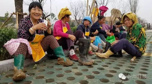 《綠化娘子軍的早餐》,在忻州一中北校區(qū),戰(zhàn)斗了一個(gè)早晨,搶時(shí)間、搶速度進(jìn)行植樹(shù)的康培綠化公司的娘子軍在吃早飯,補(bǔ)充體力。(黃濤 攝)