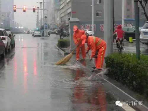 《創(chuàng)衛(wèi)先鋒》,街頭的環(huán)衛(wèi)工人冒雨工作,大雨中最美麗的身影。(班博然 攝)