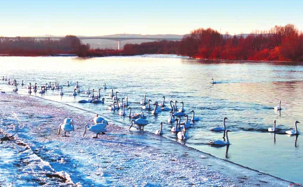 寒冬時(shí)節(jié),黃河河曲段迎來最動(dòng)人的風(fēng)景——湛藍(lán)的河面上,潔白的大天鵝如約而至,或翩躚起舞、或振翅嬉戲,為冬日的黃河增添了一抹生機(jī)與亮色。(苗吉 攝)