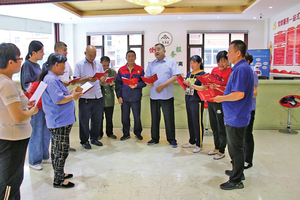 領(lǐng)到股權(quán)證的留義村村民。本報(bào)記者王秀娟攝