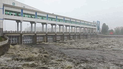 △7月20日,王家壩閘第16次開閘蓄洪,巨浪翻滾。(總臺央視記者崔琦提供)