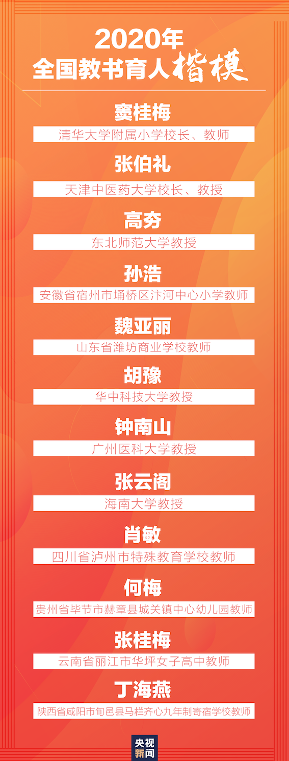 9月4日,2020年全國教書育人楷模名單發(fā)布,首次由中宣部和教育部聯(lián)合表彰,首次增加2個優(yōu)秀抗疫教師名額,共計推出12位“全國教書育人楷模”。