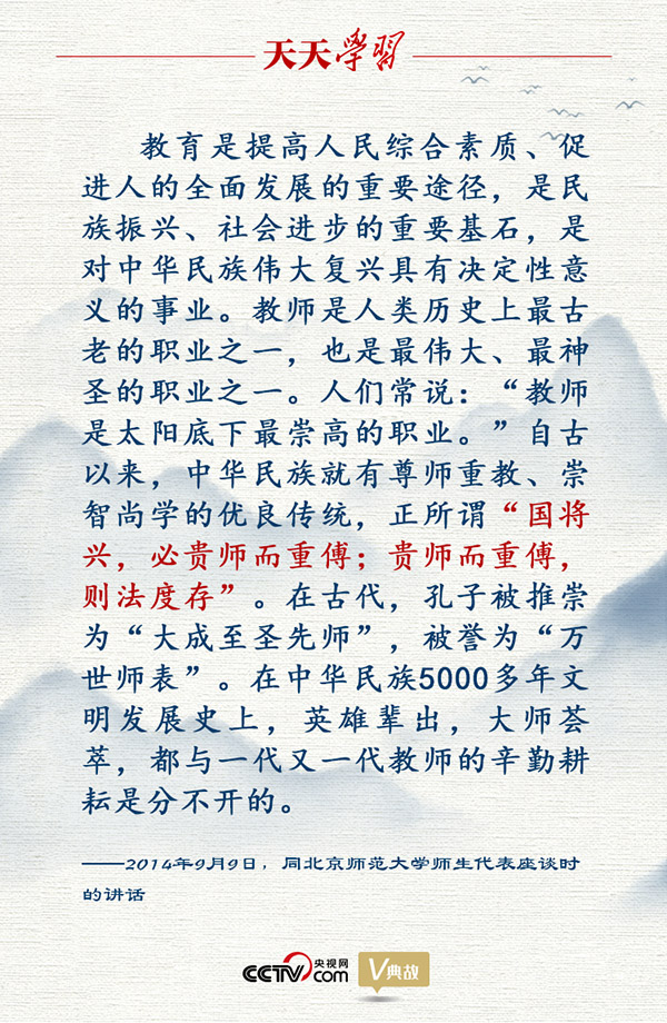 黨的十八大以來,以習(xí)近平同志為核心的黨中央高度重視教育工作,堅持把優(yōu)先發(fā)展教育事業(yè)作為推動黨和國家各項事業(yè)發(fā)展的重要先手棋。2014年9月9日,習(xí)近平總書記在同北京師范大學(xué)師生代表座談講話中,引用荀子的“國將興,必貴師而重傅;貴師而重傅,則法度存”,強(qiáng)調(diào)教育對國家繁榮、民族振興的重要意義。