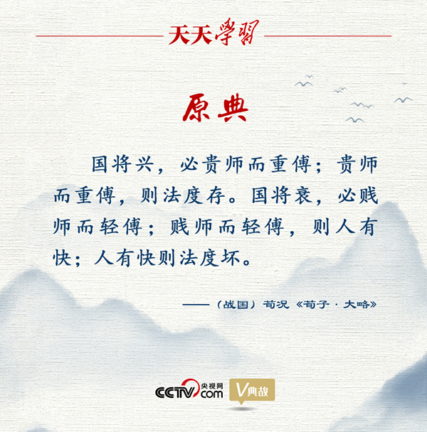 《荀子·大略》更是把教師地位提高到攸關(guān)國家興亡的高度:“國將興,必貴師而重傅;貴師而重傅,則法度存?!币馑际牵瑖覍⒁d盛,一定尊敬老師并看重有技能的人;如此,規(guī)矩和制度就能保持并得以推行。反之,國家將要衰微,一定鄙視老師并看輕有技能的人,如此人們就產(chǎn)生放肆之心;人有了放肆之心,規(guī)矩和制度就會被破壞。這一觀點在中國思想史上產(chǎn)生了十分深遠(yuǎn)的影響。