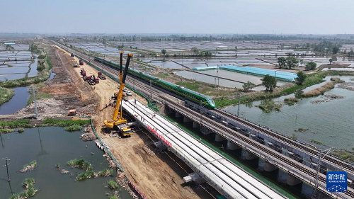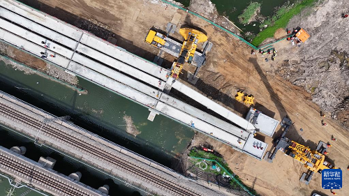 這是5月19日拍攝的沈山鐵路鴨子河中橋新建大橋架梁工程施工現(xiàn)場(chǎng)(無(wú)人機(jī)照片)。(新華社記者 吳青昊 攝)