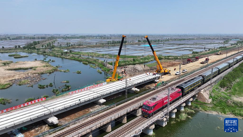 5月19日,工人在沈山鐵路鴨子河中橋新建大橋架梁工程現(xiàn)場(chǎng)施工。(新華社發(fā) 徐鳴禹 攝)