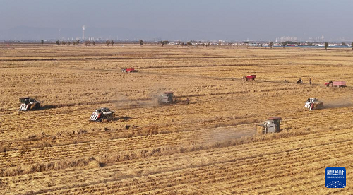 10月28日,農(nóng)民駕駛收割機在內(nèi)蒙古鄂爾多斯市達拉特旗昭君鎮(zhèn)沙圪堵村收獲水稻(無人機照片)。(新華社記者 賈立君 攝)