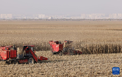 10月28日,農(nóng)民駕駛收割機在內(nèi)蒙古鄂爾多斯市達拉特旗收獲玉米。(新華社記者 賈立君 攝)