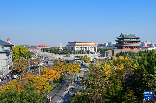 11月3日拍攝的北京天安門廣場建筑群及周邊的秋色。(新華社記者 陳曄華 攝)
