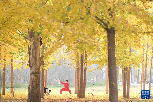 11月4日,市民在石家莊市的河北經(jīng)貿(mào)大學(xué)的銀杏林下晨練。(新華社發(fā) 陳其保 攝)