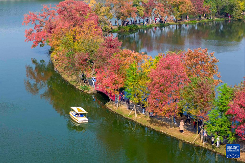 11月2日,游客在江蘇南京中山植物園月牙堤上賞秋游玩(無人機照片)。(新華社發(fā) 史俊 攝)