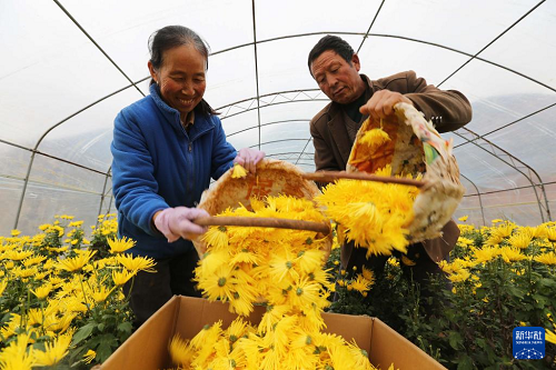 11月5日,甘肅省定西市臨洮縣康家集鄉(xiāng)的村民將采摘的金絲皇菊裝箱。(新華社發(fā) 王克賢 攝)