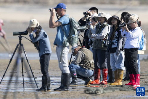 11月9日,中外觀鳥(niǎo)愛(ài)好者在泉州圍頭灣灘涂上觀測(cè)勺嘴鷸。(新華社記者 魏培全 攝)