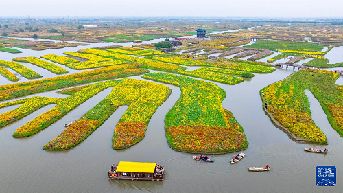11月10日,游客在江蘇省興化市千垛景區(qū)乘船游玩(無(wú)人機(jī)照片)。(新華社發(fā) 周社根 攝)