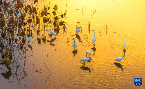 在甘肅省酒泉市阿克塞哈薩克族自治縣,白鷺在冬不拉水庫(kù)棲息覓食(無(wú)人機(jī)照片,11月9日攝)。(新華社發(fā) 高宏善 攝)