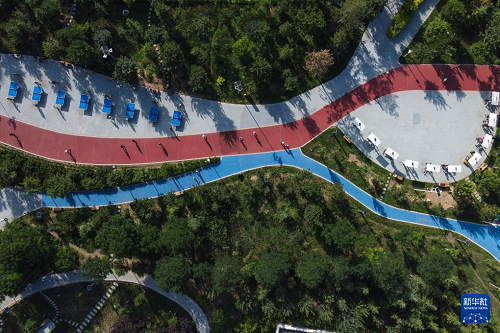 2025年7月7日,市民在平?jīng)鍪嗅轻紖^(qū)中心城區(qū)的平?jīng)龀鞘谢盍珗@休閑健身(無人機照片)。(新華社發(fā) 吳希會 攝)