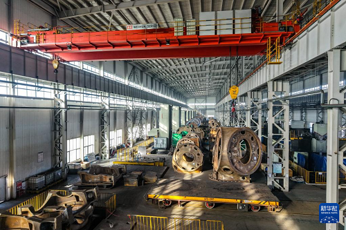 11月20日,在甘肅省酒泉經(jīng)濟(jì)技術(shù)開(kāi)發(fā)區(qū)的日月重工(甘肅)有限公司機(jī)加車間,工作人員操作起重機(jī)轉(zhuǎn)運(yùn)風(fēng)機(jī)輪轂(無(wú)人機(jī)照片)。(新華社記者 郎兵兵 攝)