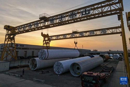 11月20日,在甘肅省酒泉經(jīng)濟(jì)技術(shù)開(kāi)發(fā)區(qū)的中國(guó)水電四局(酒泉)新能源裝備有限公司裝運(yùn)生產(chǎn)線上,工作人員進(jìn)行風(fēng)機(jī)塔筒吊裝作業(yè)(無(wú)人機(jī)照片)。(新華社記者 郎兵兵 攝)