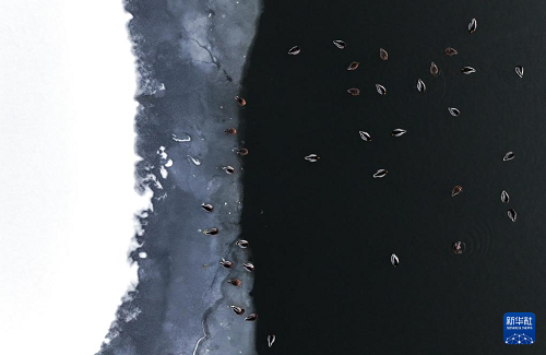 11月27日在松花江哈爾濱段拍攝的綠頭鴨寒江休憩、覓食場(chǎng)景(無(wú)人機(jī)照片)。(新華社發(fā) 張樹(shù) 攝)