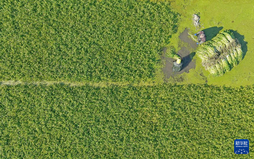 12月7日,江蘇省海安市墩頭鎮(zhèn)長(zhǎng)垎村水芹菜種植基地,菜農(nóng)在水田里采收水芹菜(無(wú)人機(jī)照片)。(新華社發(fā) 周強(qiáng) 攝)