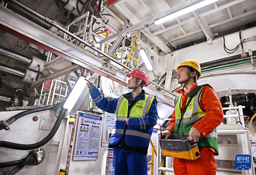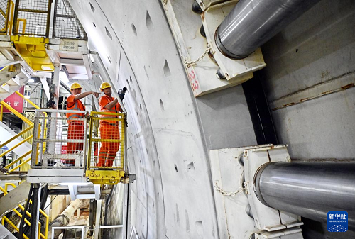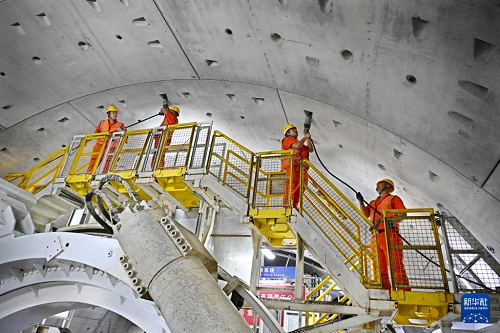 12月15日,中鐵十四局建設(shè)者在海平面下91米進(jìn)行管片安裝作業(yè)。(新華社記者 李紫恒 攝)