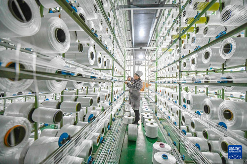 12月16日, 工人在山東棗莊經(jīng)濟(jì)開發(fā)區(qū)一家企業(yè)的智能化生產(chǎn)線上加工高端紗線。(新華社發(fā) 孫中喆 攝)