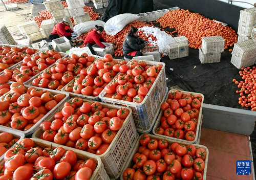 12月29日,肅寧縣萬(wàn)里鎮(zhèn)一家蔬菜種植合作社的社員在分揀收獲的西紅柿。(新華社記者 楊世堯 攝)