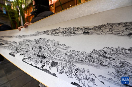 這是12月29日在天津古文化街“喜迎馬年,五代畫馬人馬畫藝術(shù)展”上拍攝的畫家宮春虎的作品《萬(wàn)馬圖》(局部)。(新華社記者 趙子碩 攝)