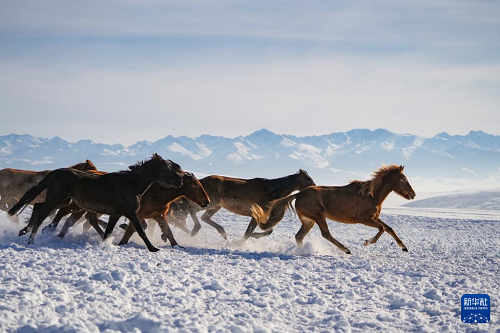 這是1月3日在新疆昭蘇濕地公園拍攝的“天馬踏雪”表演。(新華社記者 徐宏巖 攝)