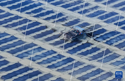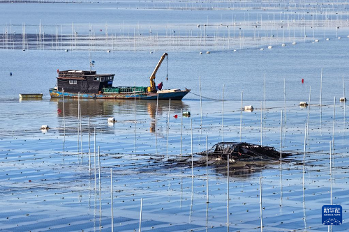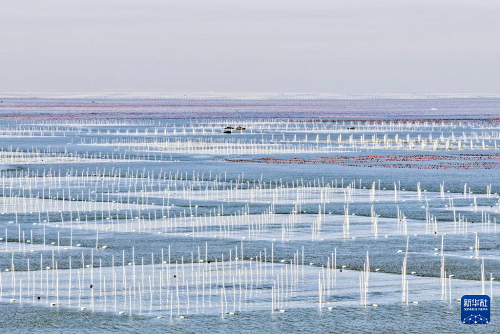 1月8日,漁民在江蘇連云港市海州灣漁場(chǎng)養(yǎng)殖區(qū)收獲條斑紫菜(無人機(jī)照片)。(新華社發(fā) 王健民 攝)