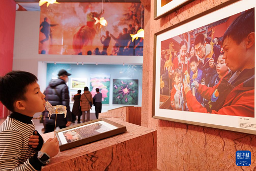 1月26日,在中國(guó)非物質(zhì)文化遺產(chǎn)館舉行的展覽現(xiàn)場(chǎng),小朋友被一幅攝影作品吸引。(新華社記者 金立旺 攝)