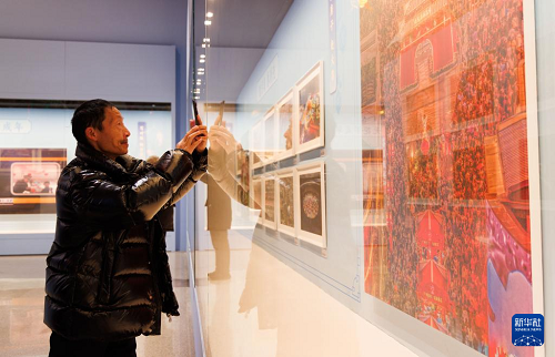 1月26日,在中國(guó)非物質(zhì)文化遺產(chǎn)館舉行的展覽現(xiàn)場(chǎng),觀眾用手機(jī)拍攝展覽作品。(新華社記者 金立旺 攝)