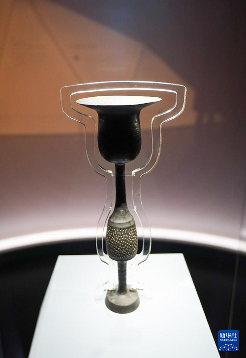 這是1月27日在山東博物館“對話蛋殼黑陶高柄杯”明星文物展上拍攝的大汶口文化黑陶高柄杯。(新華社記者 徐速繪 攝)