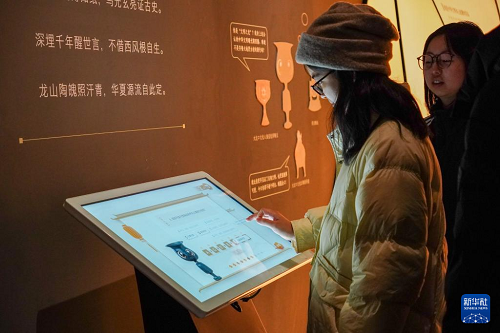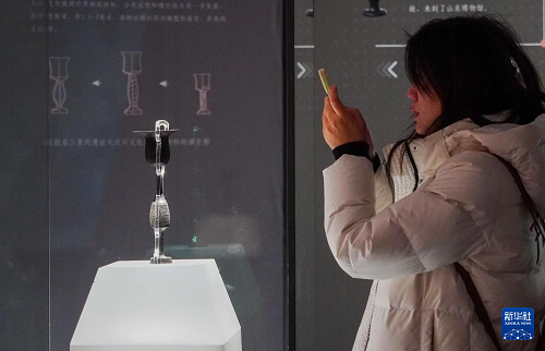 1月27日,在山東博物館“對話蛋殼黑陶高柄杯”明星文物展上,一名參觀者觀看龍山文化蛋殼黑陶高柄杯。(新華社記者 徐速繪 攝)