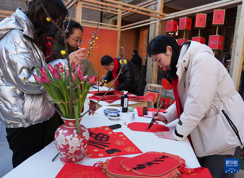 2月8日,書法家們在游園會上為市民寫春聯(lián)和福字。(新華社記者 劉穎 攝)