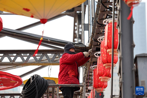 2月9日,工作人員在蘭州市城關區(qū)中山橋上懸掛燈籠。(新華社發(fā) 侯崇慧 攝)
