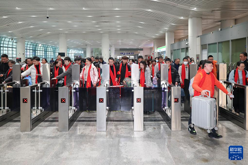 2月11日,棗陽籍務工團體在上海站優(yōu)先檢票進站。(新華社記者 王翔 攝)