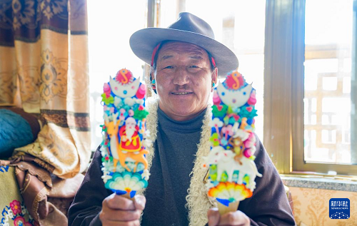 2月12日,在拉薩市林廓東路,來自西藏日喀則市仁布縣普松鄉(xiāng)的手工藝人羅布展示做好的酥油花。(新華社記者 丁增尼達(dá) 攝)