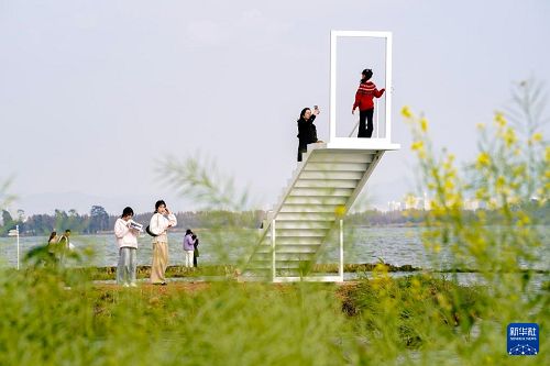 2月26日,游客在滇池邊一處拍照裝置拍照。(新華社記者 陳欣波 攝)