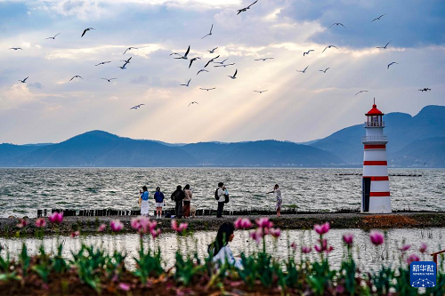 春日暖陽下,昆明滇池碧波蕩漾,遠山如黛,紅嘴鷗翩躚起舞。游人沿岸漫步、駐足拍攝,共繪出一幅生動宜人的春游畫卷。