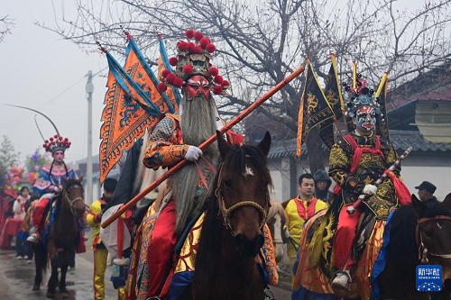 3月2日,隴縣黃花峪村社火隊在游演途中。(新華社記者 鄒競一 攝)