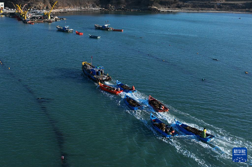 3月9日,在山東省榮成市愛倫灣海洋牧場,滿載海帶的養(yǎng)殖船駛往碼頭(無人機照片)。(新華社發(fā) 王福東 攝)