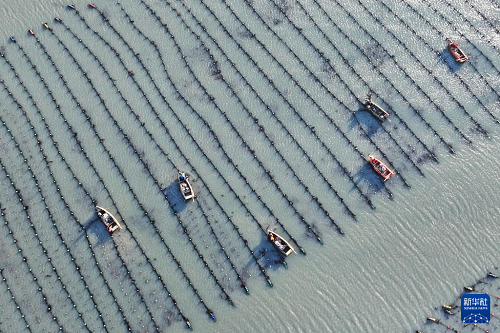 3月9日,在山東省榮成市愛倫灣海洋牧場海帶養(yǎng)殖區(qū),養(yǎng)殖工人收獲海帶(無人機照片)。(新華社發(fā) 李信君 攝)