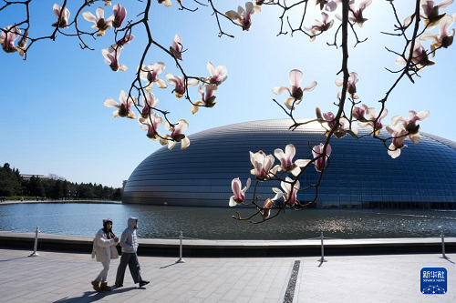 3月9日,游客在國家大劇院旁欣賞盛開的玉蘭花。(新華社記者 鞠煥宗 攝)