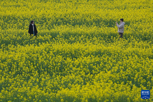 天氣漸暖,位于富春江畔的浙江杭州桐廬縣桐君街道梅蓉村千畝油菜花田進入盛開期,吸引不少游客前來觀光游玩。