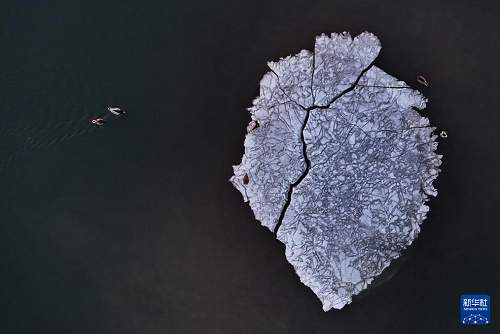 3月22日,幾對綠頭鴨在松花江哈爾濱段一處水域游弋(無人機照片)。(新華社發(fā) 張樹 攝)