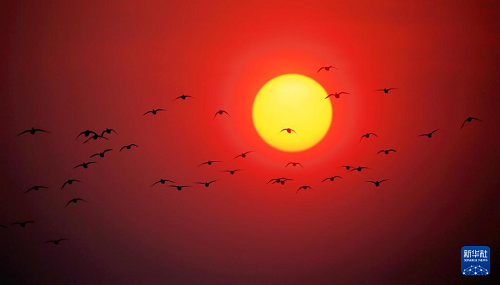 3月22日,一群候鳥在松花江哈爾濱段上空迎著旭日飛翔。(新華社發(fā) 張樹 攝)